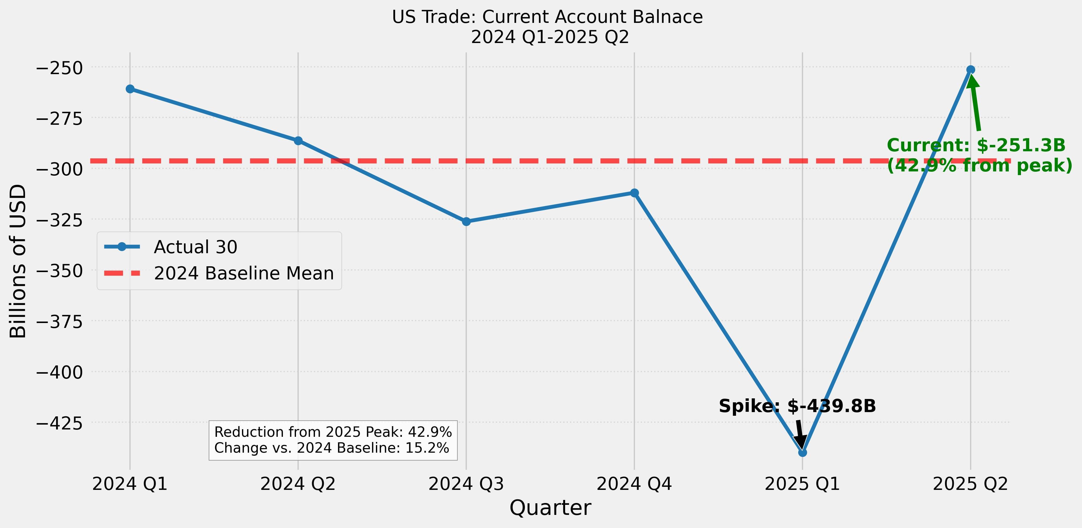 From what we can see above, the claim that the deficit has been isolated in comparison to the period immediately before the onset of the tariffs. During that period, naturally, we saw an abnormally large spike in the deficit as anticipatory spending surged. While the current account numbers are indeed about 50 billion dollars below the 2024 mean, this represents a year over year reduction of about 17% rather than 50%. If one considers the drag on demand that the previous anticipatory surge more than likely caused, this 17% too is undoubtedly an overestimate of the effect of trump’s policy on the fall. I would argue this represents a reversion to the mean and behavioral effects more than anything.